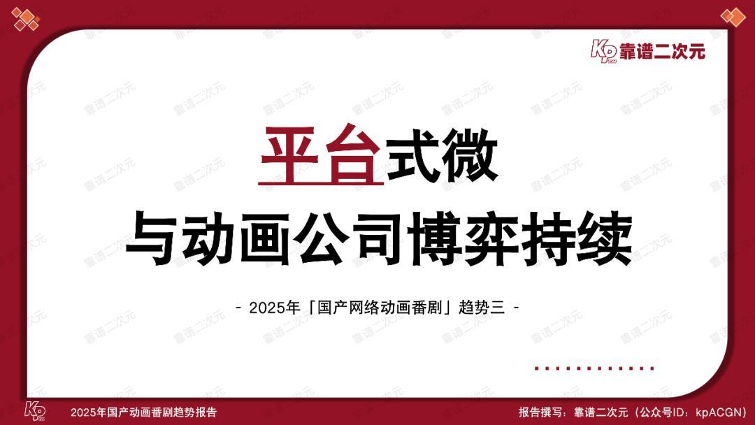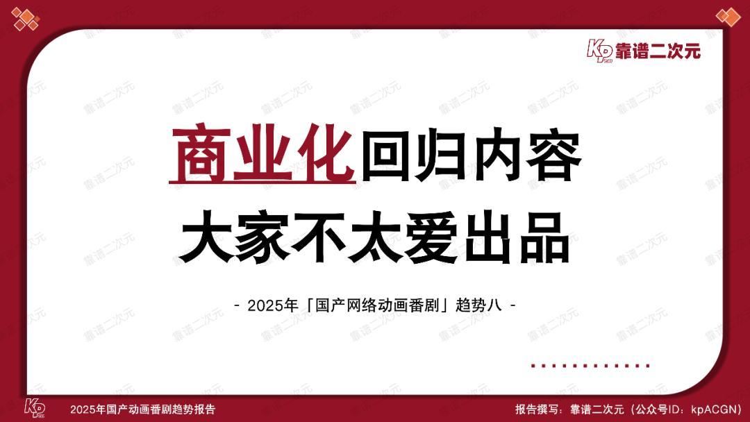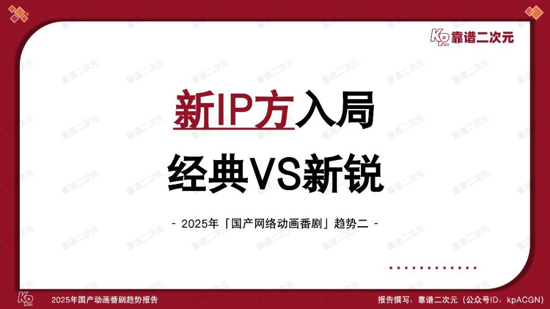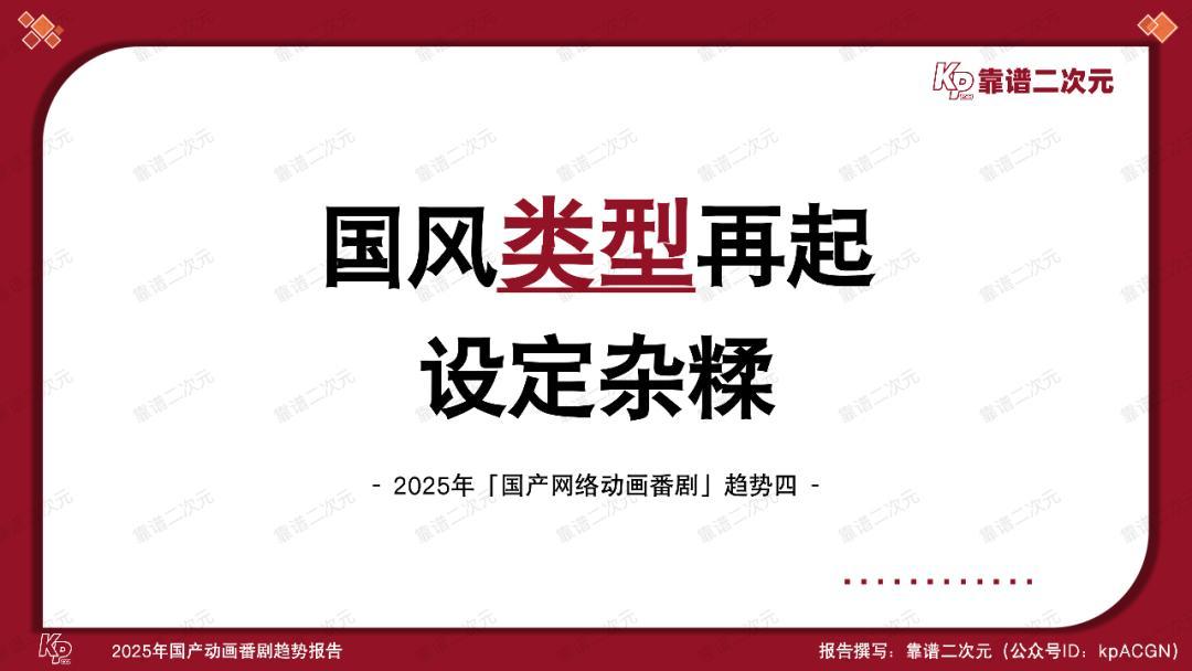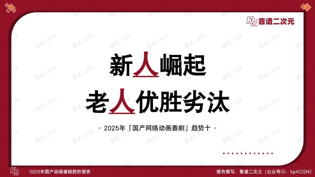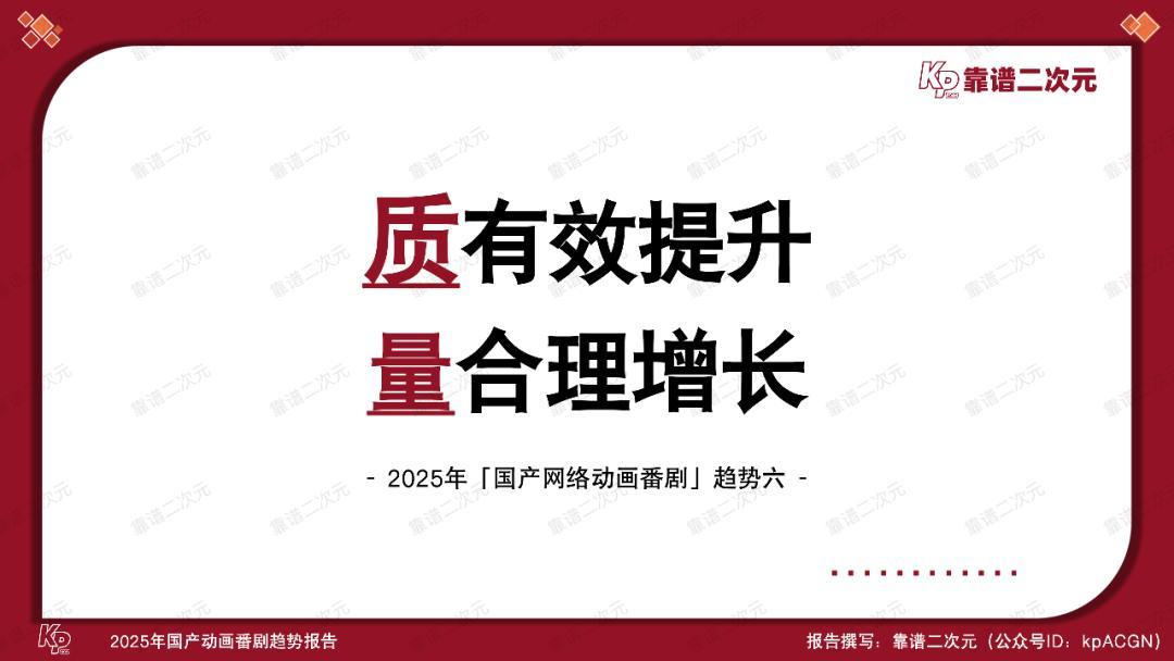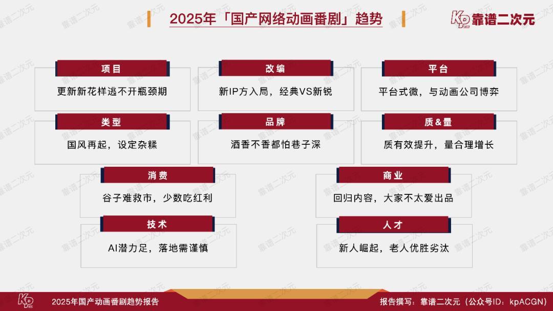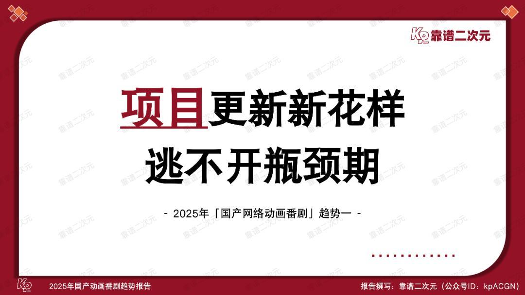 动画电影在大荧幕上沧海桑田,动画番剧产业也在悄然走过万水千山。本文是靠谱二次元(公众号ID:kpACGN)出品的第四个「国产动画番剧」年度趋势报告。此前三年报告中的趋势逐一成为产业现状,而今,伴随产业步入全新台阶,这次的2025年「国产动画番剧」趋势报告依旧会通过十条趋势,剖析产业动态,引领产业发展。