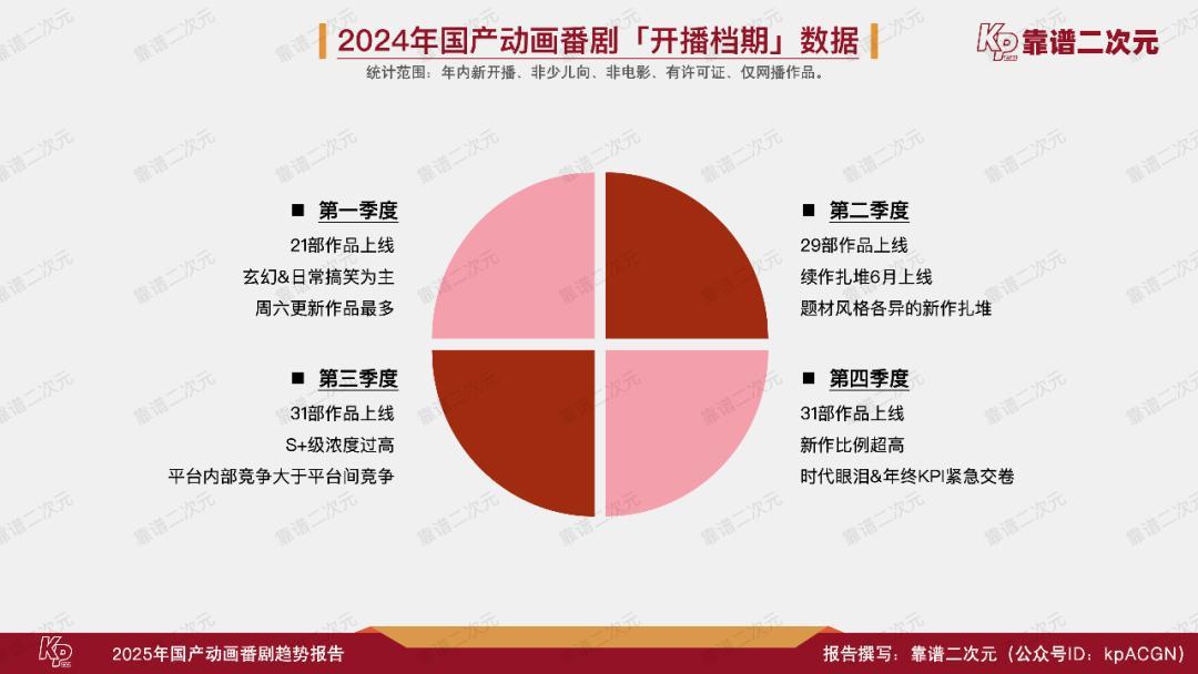 2024年国产动画番剧在开播档期的选择上,季度性正在减弱。动画更新频率的均衡代表着动画生产和播出进入常态化。其中Q1(第一季度)稍有片荒现象,开播21部作品,Q2开播29部,Q3开播31部,Q4开播31部。