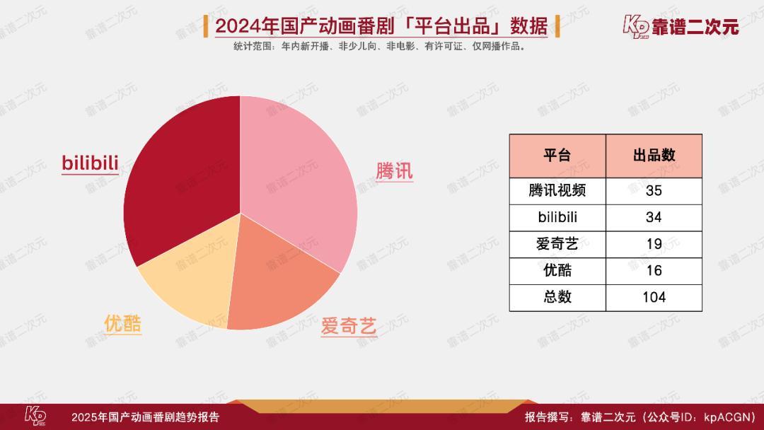 区别于往年的bilibili蝉联出品数量第一,今年出品动画最多的平台是腾讯视频,35部;bilibili34部,相比前一年的44部有明显收缩;爱奇艺19部、优酷16部,比2023年的20+部略有下降。平台出品绑定了独播业务,但独播不一定出品,出品大概率首播,为了缓解片荒压力,各家平台友好互换完结作品播放权益的现象持续增加。