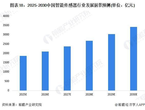 " 十四五 " 期间,随着国内多项政策的陆续出台,进一步鼓励智能传感器产业的发展,智能传感器作为现实世界与数据世界的桥梁,处于物联网整个构架体系的核心地位,在各个领域中有着广阔的前景。结合信通院数据,前瞻初步预测,到 2030 年,中国智能传感器行业规模有望突破 3400 亿元。