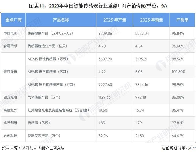 当前,我国智能传感器代表性厂商已实现了规模化供应能力,厂商通常基于行业的需求情况制定生产计划,从代表性企业披露的产销情况来看,2023 年中国智能传感器重点厂商的产销率多处在较高水平,为行业的平稳运行打下了良好的基础。