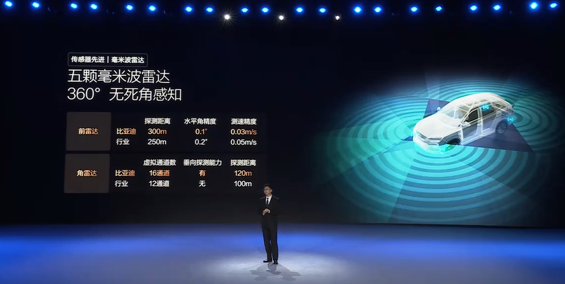 不过别担心纯视觉方案会翻车,比亚迪还加了5颗毫米波雷达来补足短板。