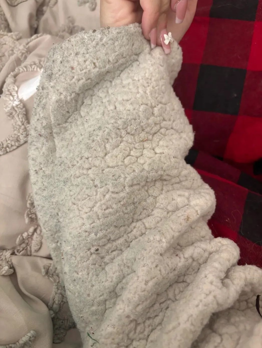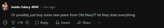 “污渍看起来很像黑色或蓝色牛仔裤褪色沾染到的样子。”