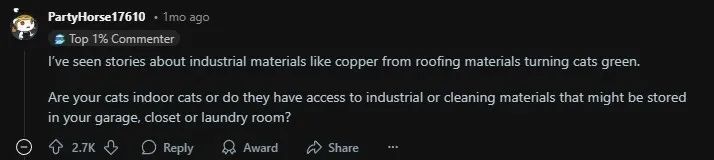 “你的猫是家养的吗?有没有可能接触到了车库、壁橱、洗衣房里的工业材料、清洁材料之类的?”