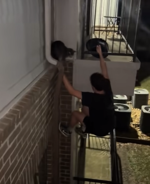 这不,一位小哥看到猫咪被困在墙上了,便热心的想要爬上去把小猫救下来。