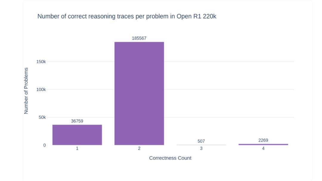 在这个过程中,OpenR1 团队发现大约 55% 的问题至少有一个正确答案。然而,NuminaMath 1.5 数据集中有很多答案是空的,或者格式不符合验证标准,这都给自动验证带来了困难。
