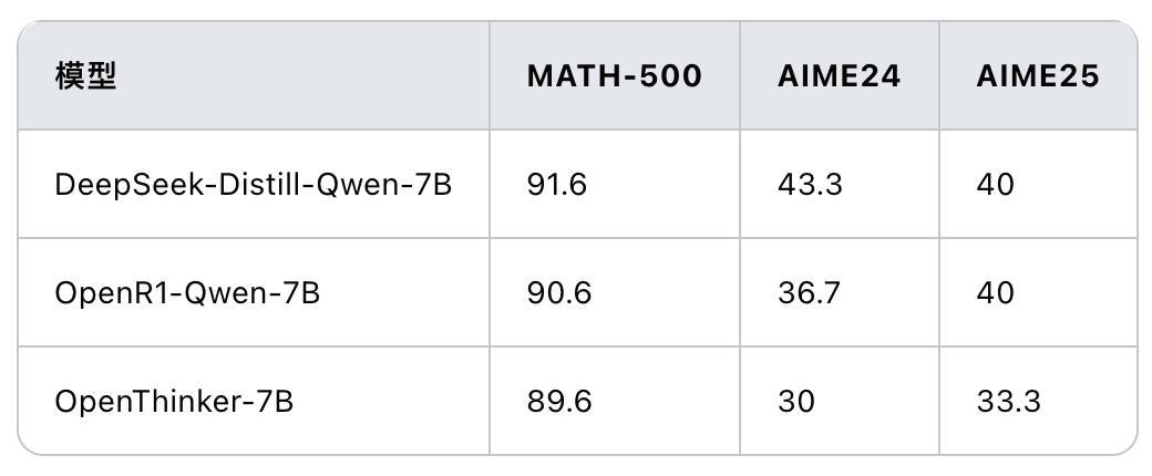 在 OpenR1-Math-220k 训练出来的 Qwen-7B-Math-Instruct,达到了与 DeepSeek-Distill-Qwen-7B 相当的性能。