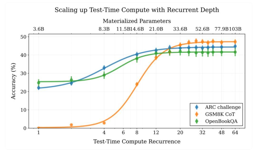 马里兰大学的一篇论文表明,通过使用循环语言模型,可以在潜在空间中隐式推理,从而在测试时扩展计算能力,这类似于 Meta 的 Coconut。这些方法的优势在于它们的计算效率更高:通过探索潜在空间,无需生成大量「思考」token 即可获得高性能。
