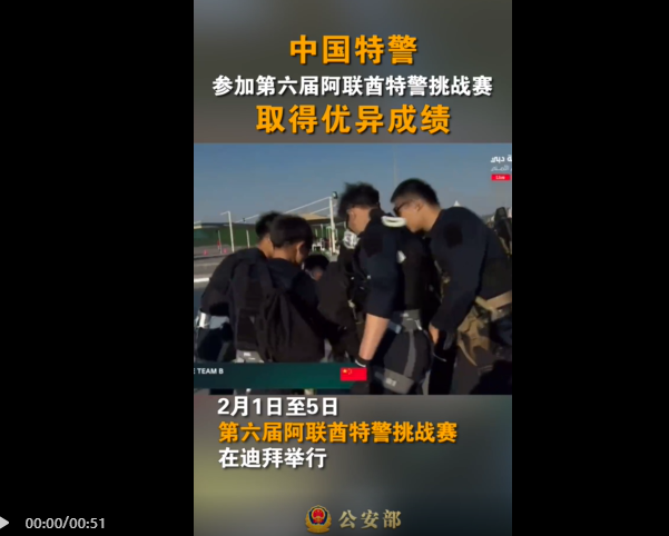据公安部消息,2月1日至5日,第六届阿联酋特警挑战赛在迪拜举行,来自46个国家的103支军警参赛队同场竞技。经过激烈角逐,由浙江公安特警组成的中国警察B队荣获团体总冠军,由安徽公安特警组成的中国警察C队荣获团体总季军,由公安特勤单位组成的中国警察A队获得团体总分第11名。三支参赛队共获得1个单项冠军、3个单项亚军、3个单项季军。