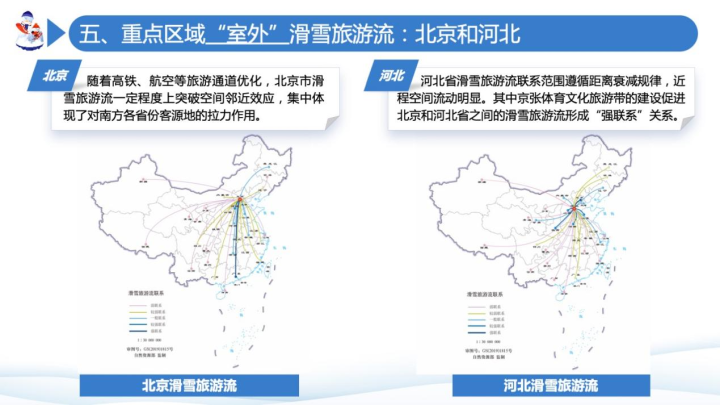 《报告》显示,2024—2025年雪季,我国部分重点区域滑雪旅游流呈现明显空间流动特征。从室外滑雪旅游来看,北京滑雪旅游流突破了空间邻近效应,对南方各省市客源具有拉动作用;河北滑雪旅游流遵循距离衰减规律,近程空间流动明显。黑龙江和吉林具有滑雪旅游资源丰富、高流入型特征,与长三角和珠三角具有强联系或较强联系的特征。借助“十四冬”的举办,内蒙古滑雪旅游持续升温,省内客源丰富,并吸引华东地区诸多游客。新疆滑雪旅游资源优势突出,具有雪期长、雪量大、雪质优等特点,已成为西部省份的主要滑雪旅游目的地。从室内滑雪旅游来看,广东和四川滑雪旅游流呈现明显的虹吸效应特征,与北京、山东等部分地区形成较为紧密的联系。