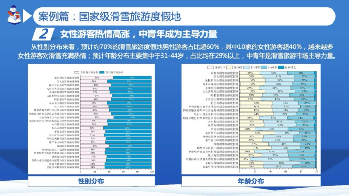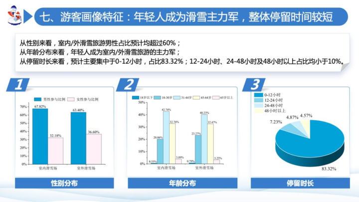 《报告》显示,2024—2025年雪季,31—44岁的游客是滑雪旅游的主力军。同时,男性游客占比预计超过60%。大多数滑雪游客的停留时长集中在0—12小时,占比约80%,而停留超过12小时的游客占比则较少,表明滑雪旅游趋向短途、快速体验。此外,约70%的游客选择在省内进行滑雪活动,体现了“就近”享受滑雪乐趣的趋势。随着滑雪设施的不断完善和市场需求的不断发展,滑雪旅游逐渐成为一种便捷且受欢迎的休闲方式,消费日常化、短途化成为新常态。