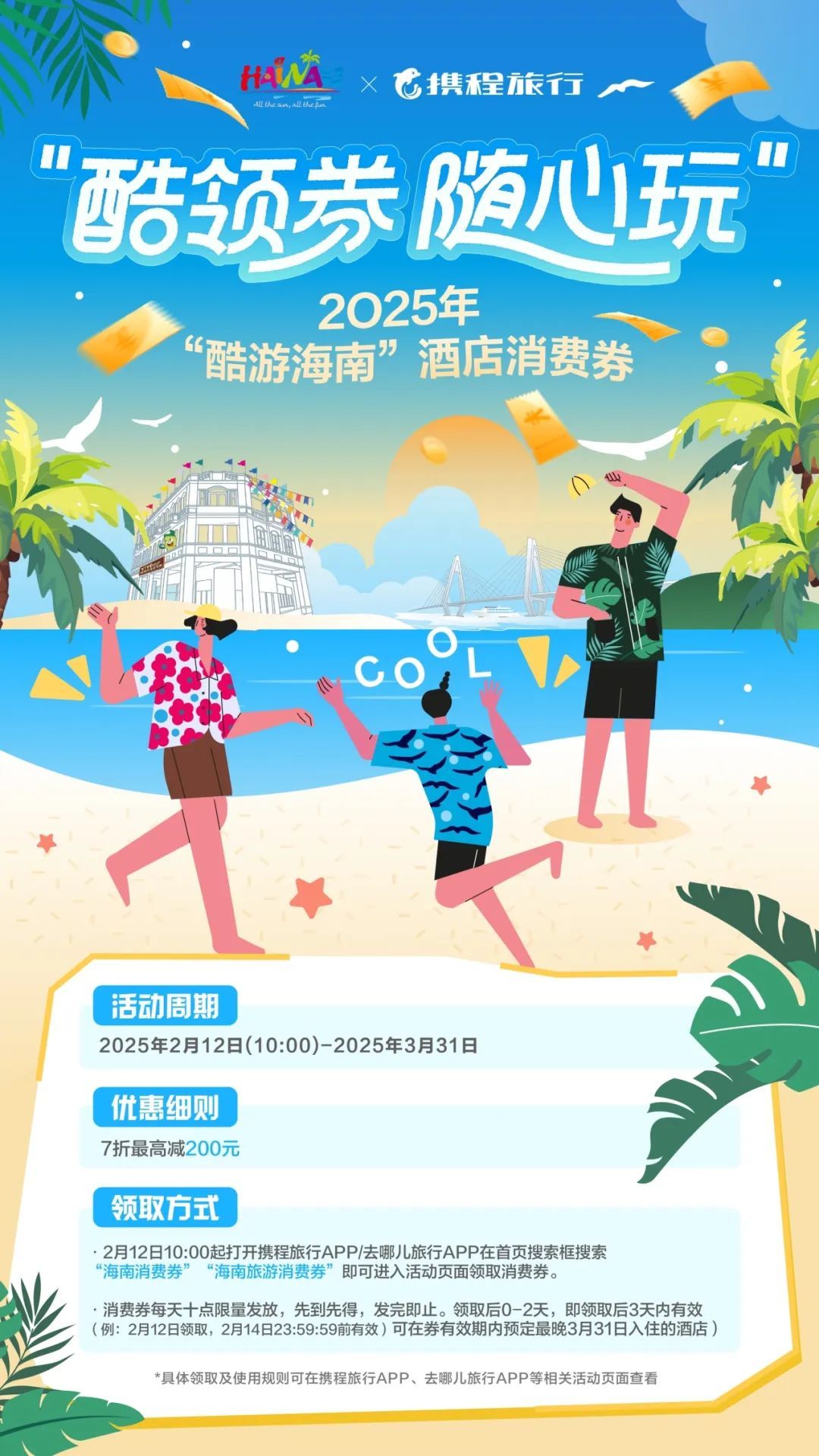 凭借“非遗年味”“避寒胜地”“免税购物”等多重标签,海南成为了近期热门的旅游目的地之一。这个春节期间,海南文旅消费市场人气持续高涨,各类文旅活动轮番上演引发出行热潮,市民游客纷纷奔赴海南感受海岛年味。为进一步提振海南旅游消费市场,抢抓第一季度旅游市场先机——由海南省旅游和文化广电体育厅联合携程集团主办的“酷领券 随心玩”2025年“酷游海南”酒店消费券发放活动于2月12日起正式启动。