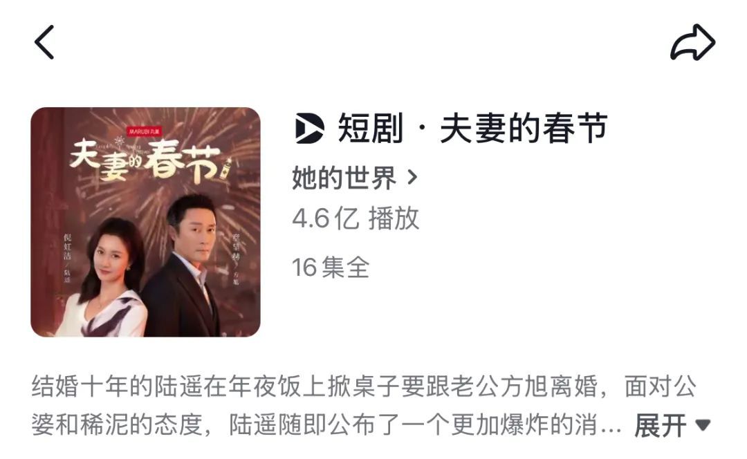 任小涵告诉刺猬公社,尽管他不看好短剧在春节档期间的表现,但他仍比较看好《老千》《夫妻的春节》这些短剧,不仅播放量较好,内容质量也属上乘,如《夫妻的春节》在抖音播放量已经高达4.6亿。