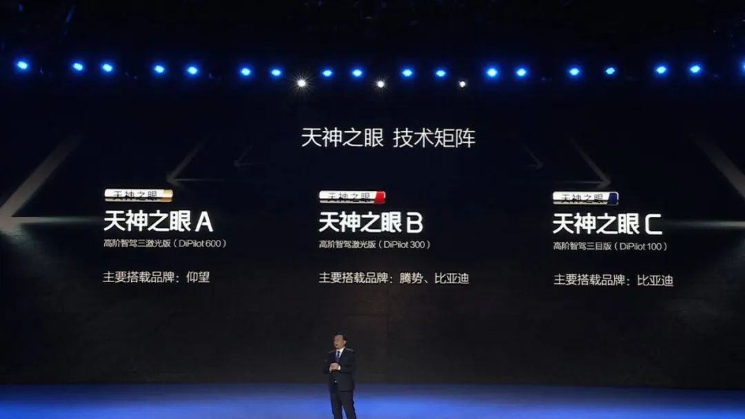 天神之眼 A(三激光雷达 DiPilot 600),或采用英伟达双Orin-X和速腾聚创的激光雷达,主要搭载在仰望品牌,配金色天神之眼尾标。