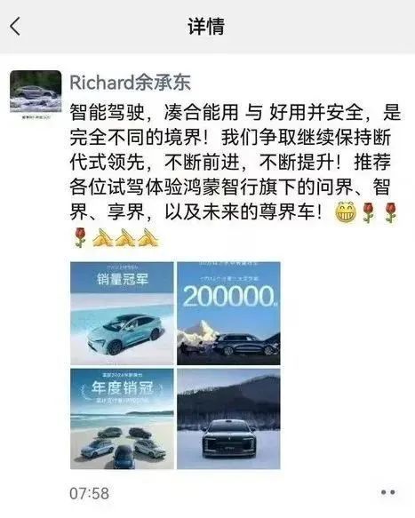余承东今天朋友圈发文称: