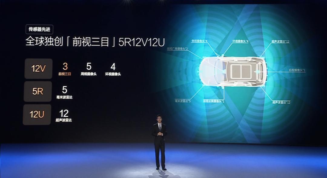 在12个摄像头中,独创的前视三目包含了2个120度广角和一个30度长焦镜头,最远探测距离350米;5个毫米波雷达,前雷达最远探测距离300米,角雷达120米,并增加垂向探测能力;12个超声波雷达,感知精度可达到1厘米。