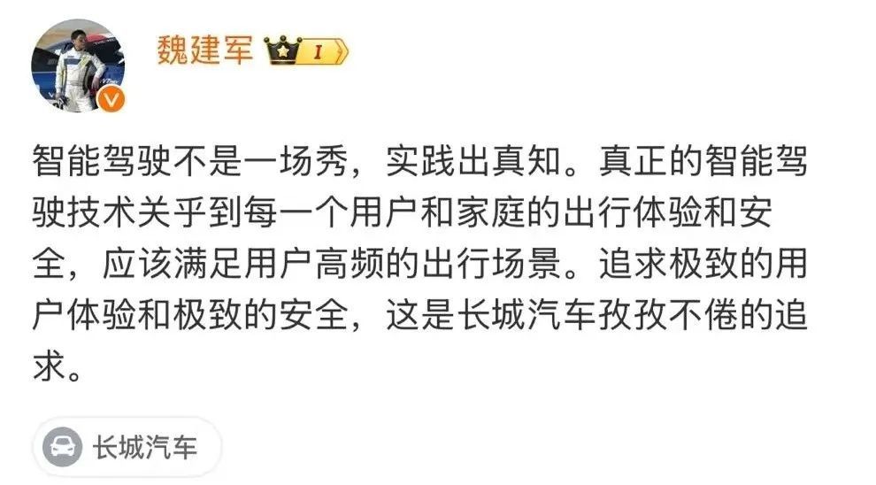 这之后长城汽车董事长魏建军也发了一条微博:智能驾驶不是一场秀。