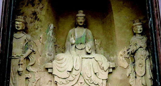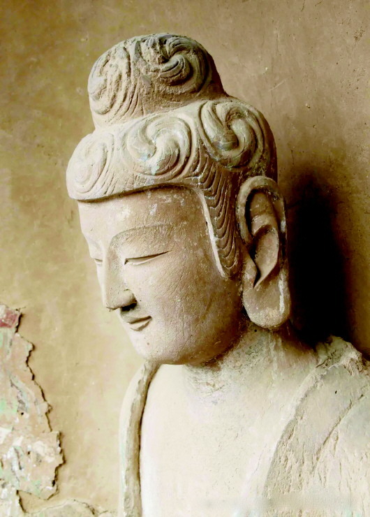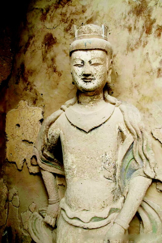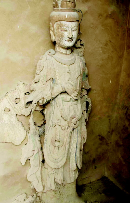 两侧菩萨:身材修长,头戴宝冠,长发披肩,面相五官与佛相似,上身袒露,下系折腰长裙,肩披帔巾,帛带绕臂飘舞而下,一手持莲花,一手提净瓶,头微微向佛靠拢,微眯的双眼露出“禅悟”的微笑,帛带的飘动,衬托出菩萨的轻盈,活泼的个性。