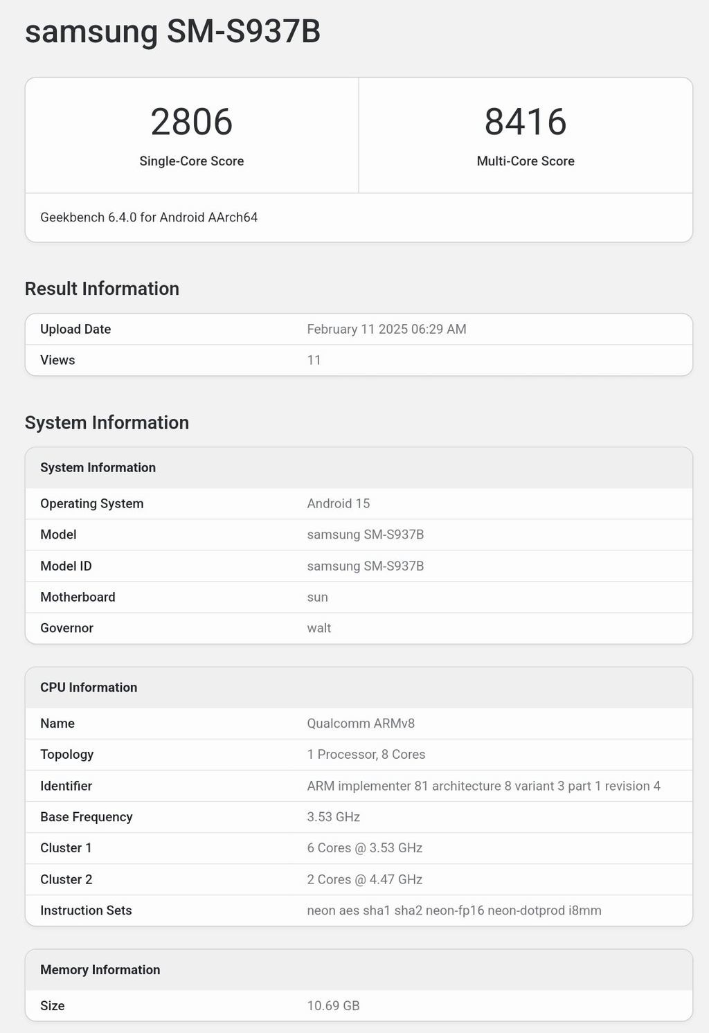 三星最薄旗舰 Galaxy S25 Edge 手机昨日(2 月 11 日)现身 GeekBench 跑分库,6.4.0 版本单核成绩为 2806 分,多核成绩为 8416 分。