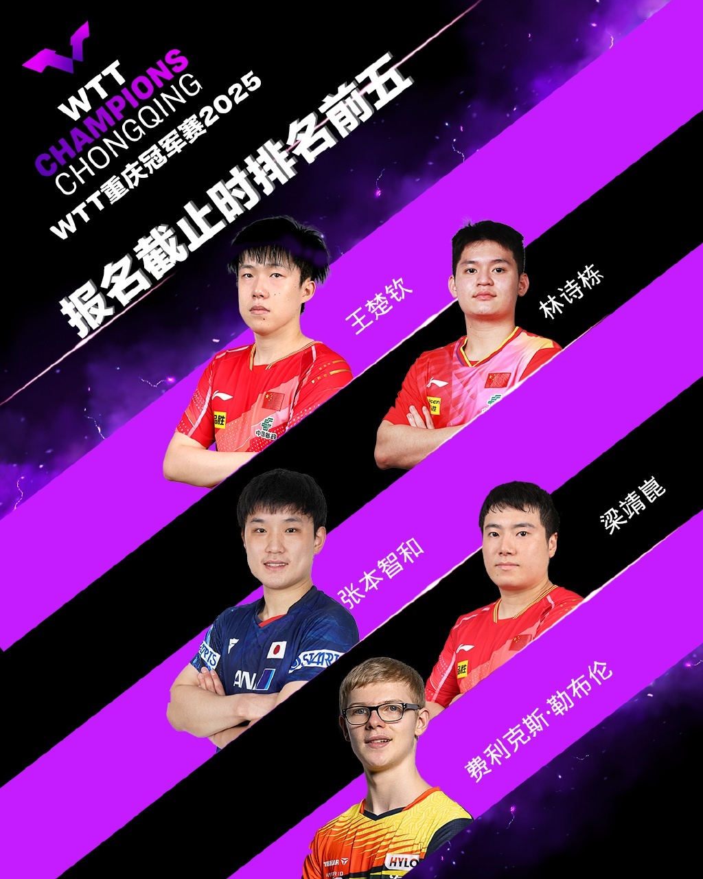 WTT重庆冠军赛2025将于3月11日至3月16日在重庆巴南区华熙LIVE·鱼洞·场馆举办。冠军将获得1000点世界排名积分。报名截止时排名前五名单如下: