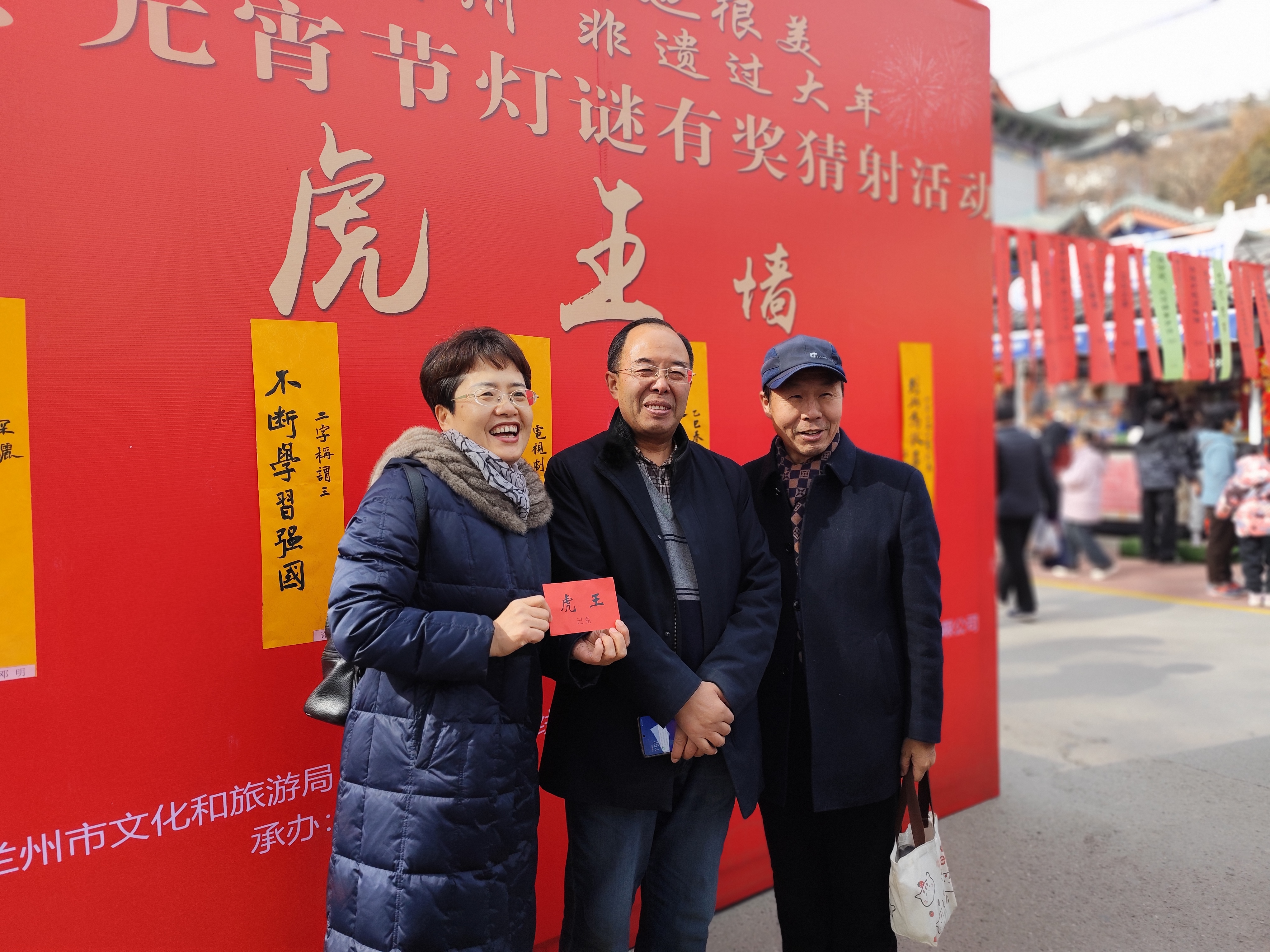 虎王墙前围着的人数并不多,也就七八位谜友围在一起热烈讨论,其中多为博学老者,也有中年文士,人人望去皆思维敏捷、自信满满。不一会,便有其中三条“虎王灯谜”被谜友接连猜中,瞬间引起现场的轰动。中奖者激动兴奋之余还要与谜条合影留念,四周投来钦佩、羡慕的目光。