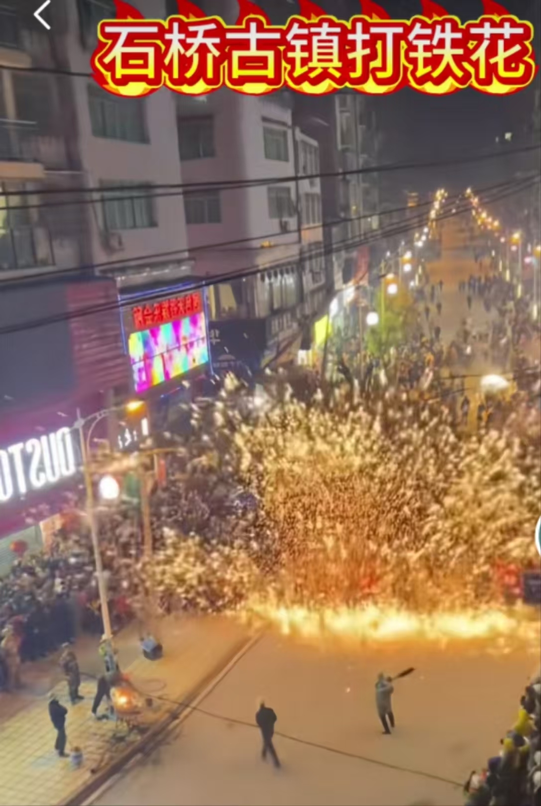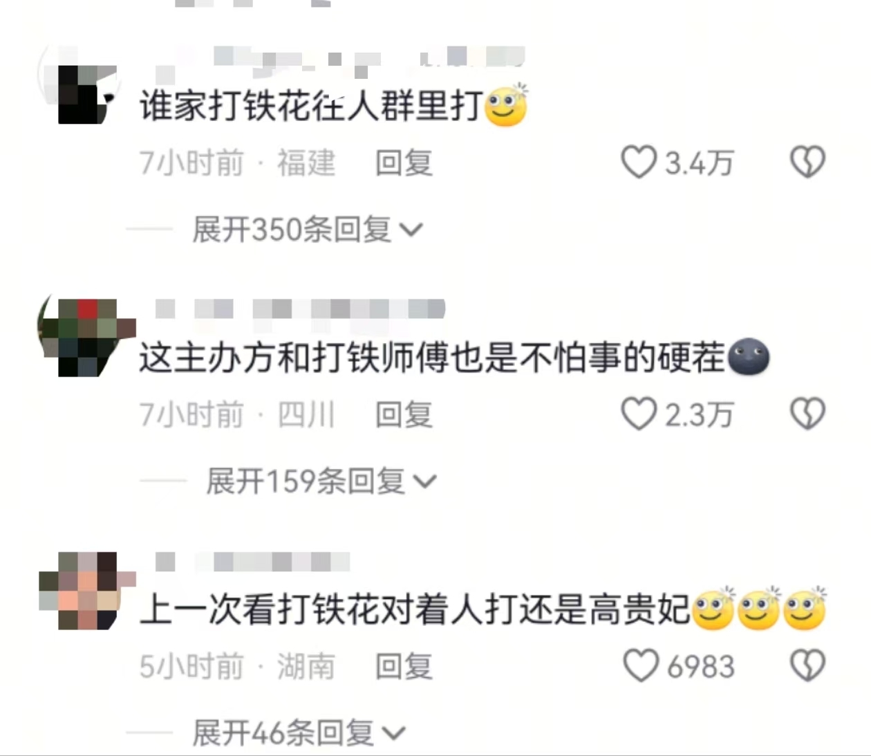 现场视频显示,在打铁花表演中,飞溅的火花向人群散去。评论区有人称自己在观看表演时衣服被烧,质疑活动存在安全隐患。