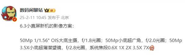 博主还曝光了OPPO Find X8 mini的影像方案:主摄采用1/1.56英寸OIS大底主摄,光圈为f/1.8;OPPO Find X8 mini采用小底超广角,光圈为f/2.0;50Mp 3.5X小底超薄潜望镜,光圈为f/2.8,与OPPO Reno13 Pro的潜望长焦数据一致,传感器应为jn5。OPPO Find X8 mini的系统焦段包括0.6X、1X、2X、3.5X、7X。