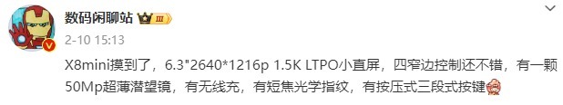 博主@数码闲聊站爆料称,OPPO Find X8 mini采用6.3英寸的1.5K小直屏,分辨率为2640*1216,四窄边控制还不错。OPPO Find X8 mini后置哈苏三摄,包含一颗超薄潜望镜头,支持50W无线闪充,取消原来的三段式按键,改用按压式三段式按键。
