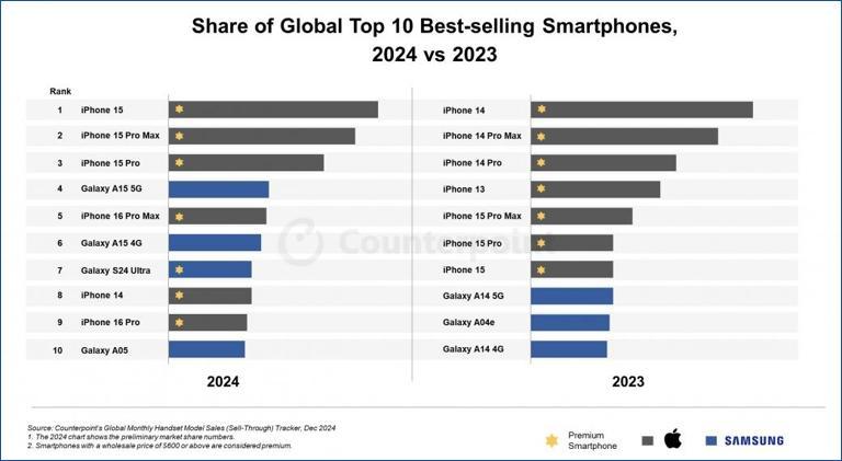 第三方数据同样证实了上述观点。Counterpoint数据显示,2024年全球最畅销手机型号为iPhone 15,并非AI手机;iPhone 14的销量也超过iPhone 16 Pro,同时还有三星三款低价手机上榜。综合网友观点和市场数据,可以得出结论:目前消费者更换手机的第一诉求并非AI,依然是传统的更新迭代。