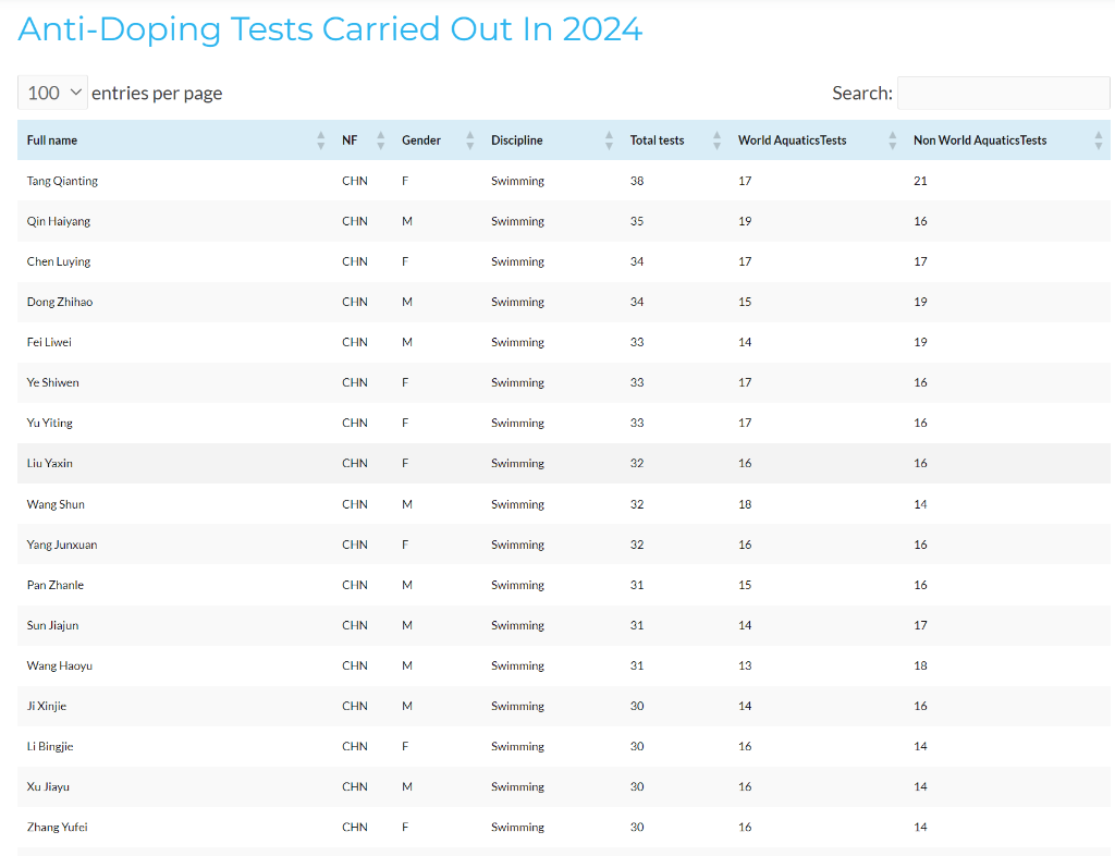 数据显示,2024年全年对世界各国和地区的游泳、跳水、花样游泳、水球、公开水域和高台跳水六大项目运动员进行了1572次赛内和赛外兴奋剂检测,中国游泳运动员接受检测次数显著偏高,在唐钱婷和覃海洋之后,年轻选手陈露颖和董志豪进行了34次检测,叶诗文、余依婷和费立纬都是33次,汪顺32次,潘展乐31次,张雨霏、李冰洁和徐嘉余都是30次,孙杨14次检查。