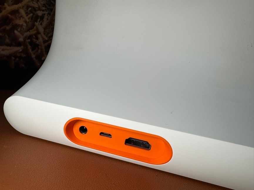 在底座后部,在醒目的橙色凹槽中,分布着机器电源插孔、USB接口以及一枚HMDI接口。是的,这款智能屏X9不仅可以在桌面代替平板使用,还可以视频输出到显示器、电视端,这个功能有多么实用,我们后边再展开聊。