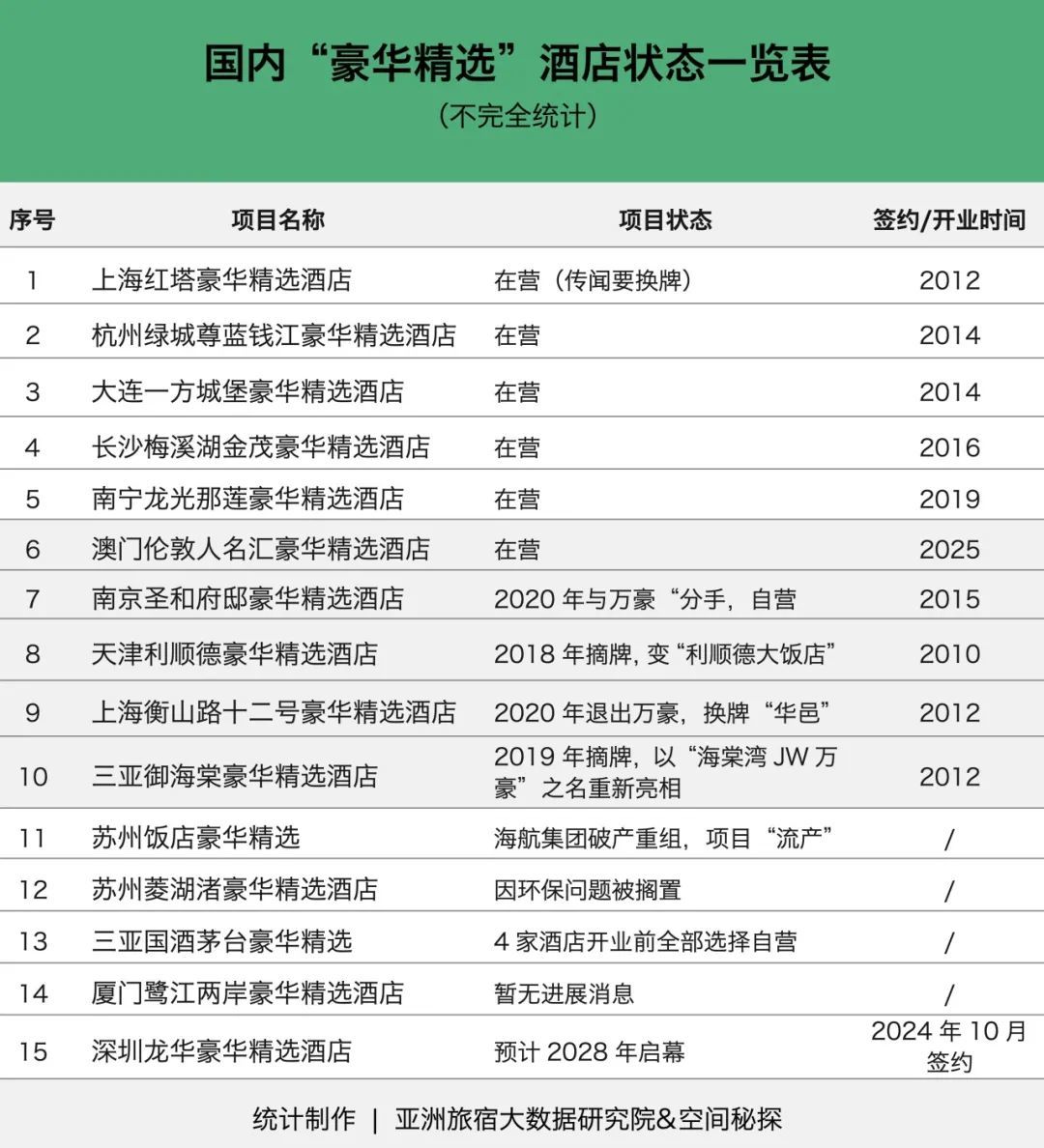 虽然豪华精选酒店品牌在不断拓展新的项目,但目前来看,目前在营业的只有6家,其他项目因为种种原因,走向了其他两个不同的“路口”。