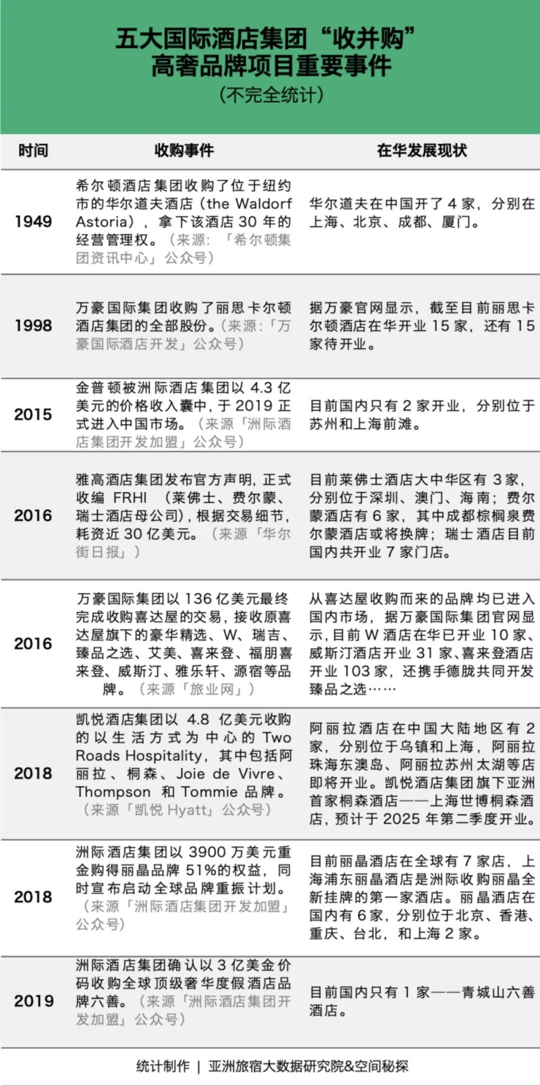 从成立,到“易主”,再到全球拓展的发展路径不仅是豪华精选酒店品牌的真实写照,也符合众多高奢酒店品牌的发展路径。万豪、希尔顿、洲际、凯悦、雅高等头部国际酒店集团的“壮大”也是在一次次“收并购潮”下形成的。