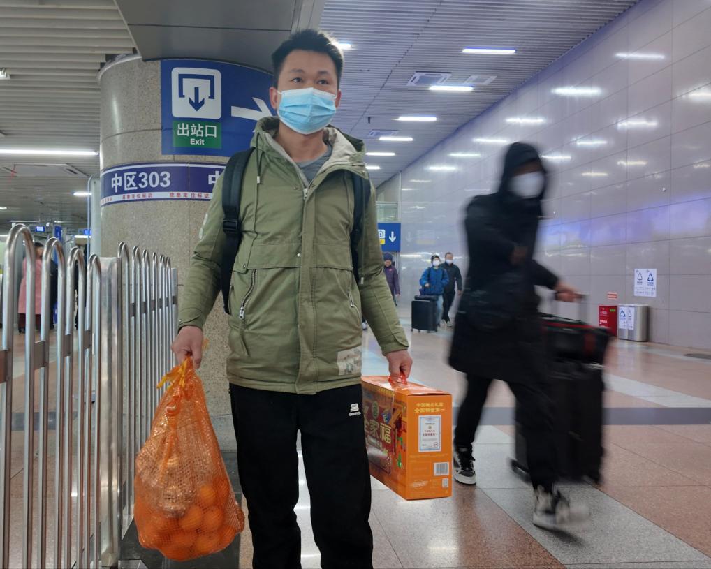 返程的人流中,湖北宜昌王先生的一袋子蜜桔显得与众不同。