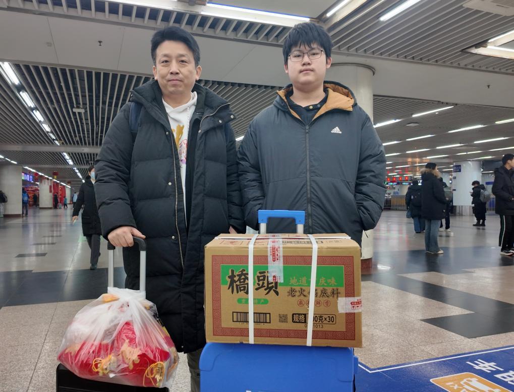 来自重庆的高先生带着儿子从老家返回。他们的行李中,一大箱火锅底料让人看着就感觉味蕾萌动。