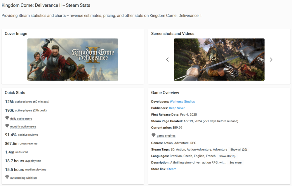 自2月5日发售以来,《天国:拯救2》迅速登顶Steam全球热销榜第一,仅用一天时间便实现销量破百万、成功回本,并创下Steam在线玩家峰值25万的成绩。