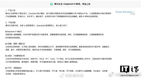 【#腾讯元宝接入DeepSeek#】#腾讯元宝官宣接入DeepSeek#2月13日,腾讯元宝在应用商店发布更新,并宣布 DeepSeek R1 模型联网、满血上线。官方表示,腾讯元宝是依托于腾讯混元、DeepSeek 大模型,基于跨知识领域和自然语言理解能力的大模型 AI 产品。其支持对用户的提问进行深度思考、逻辑推理和详细回答,同时也支持联网搜索信息,以提高推理和回答的时新性和权威性。