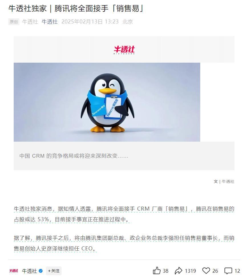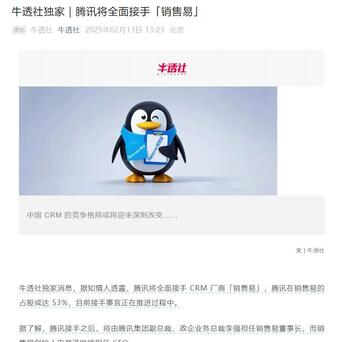 #腾讯#据牛透社独家报道,有知情人士透露,腾讯将全面接手 CRM 厂商“销售易”,腾讯在销售易的占股或达 53%,目前接手事宜正在推进过程中。