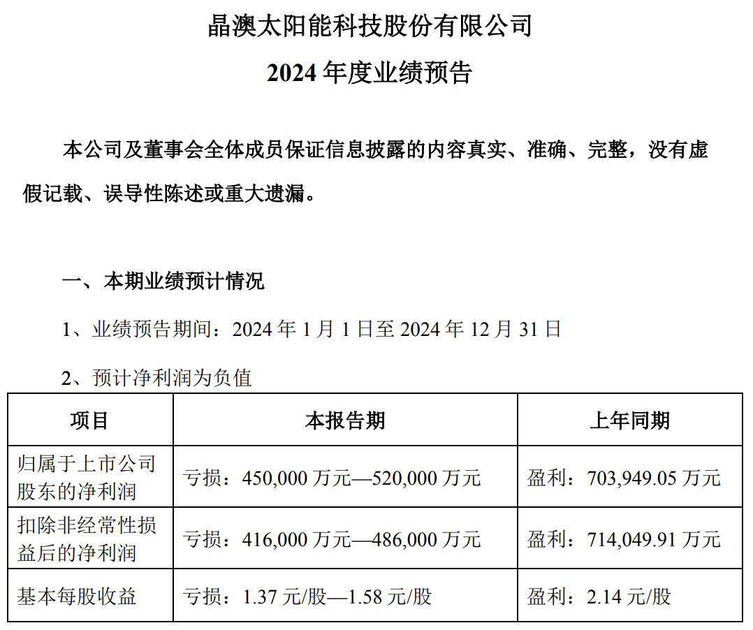 对于2024年业绩巨亏的原因,晶澳科技在财报预告中给出了解释: