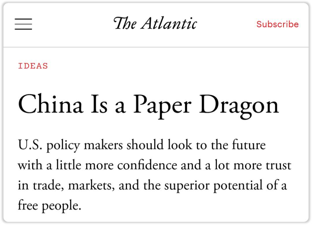 2021年,美国《大西洋月刊》发了篇文章《中国是只“纸龙”》(China Is a Paper Dragon)。