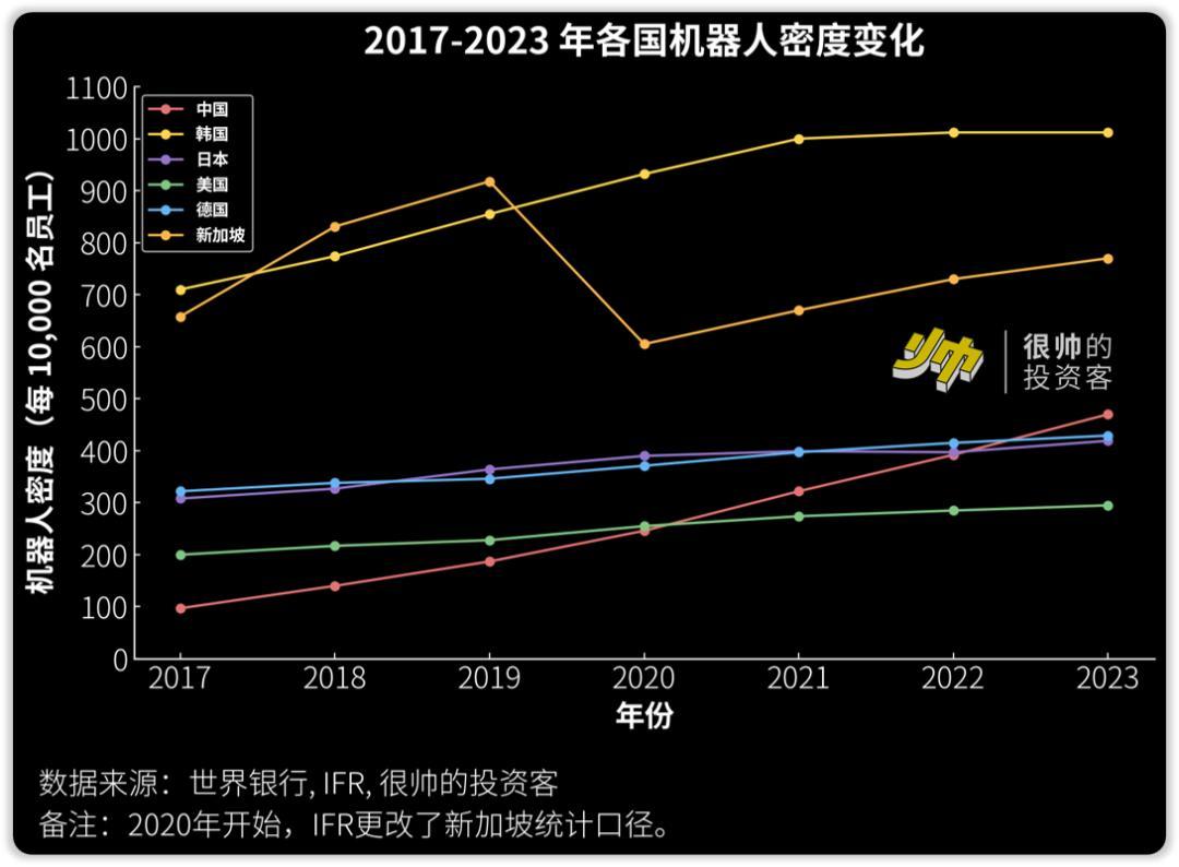 但是在8年后的2023年,咱的工业机器人密度就已经翻了快10倍(49→470),一举超越了日本和德国,位居全球第三了。