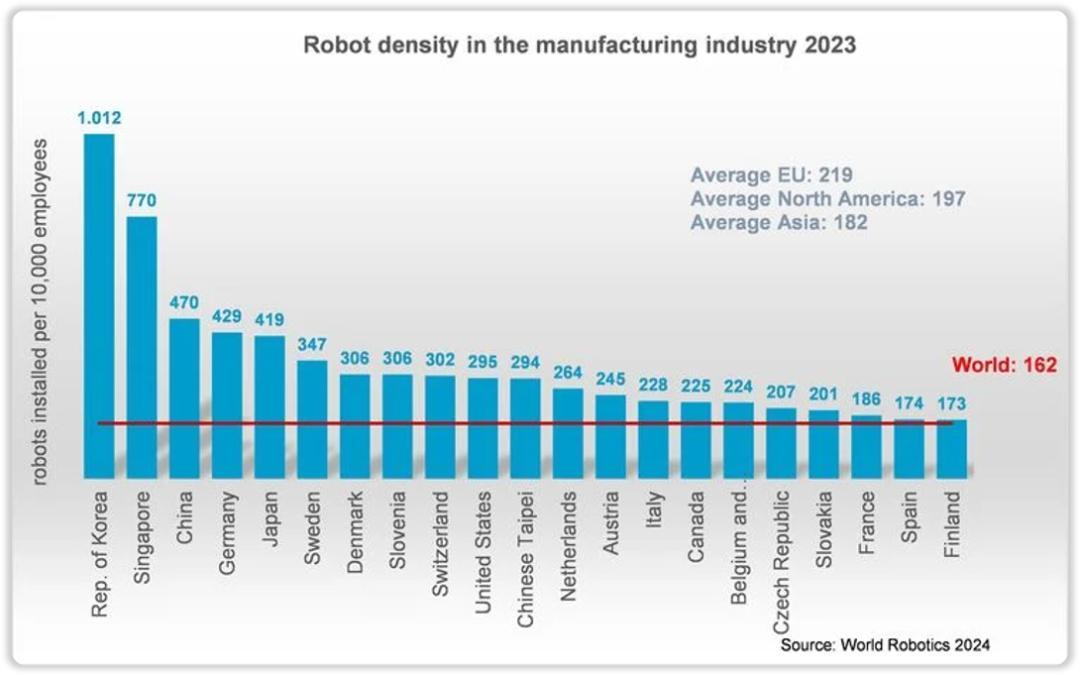 咱2015年提出的 《中国制造2025》 里头给2020年的机器人密度定的目标是150台/万人。