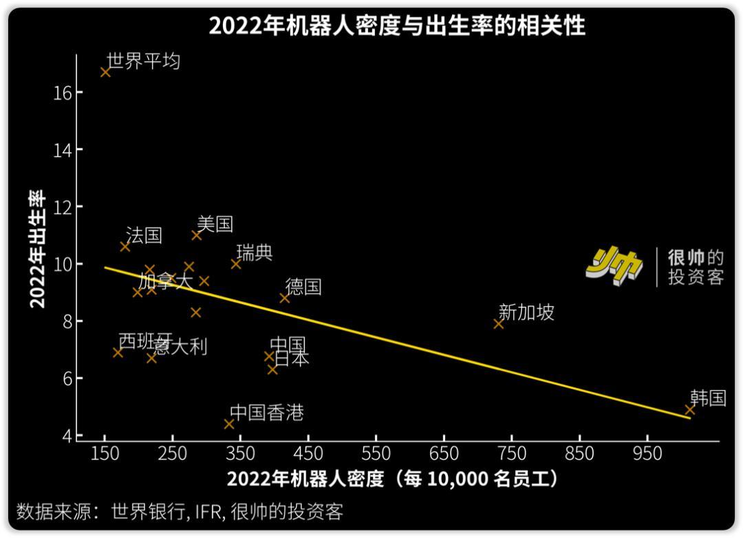 可能也是因为这样,工业机器人的「四大家族」(ABB/库卡/FANUC/安川)里头,一个来自瑞士,一个来自德国,还有两个来自日本,都是 出生率较低、老龄化程度较高的地方 。