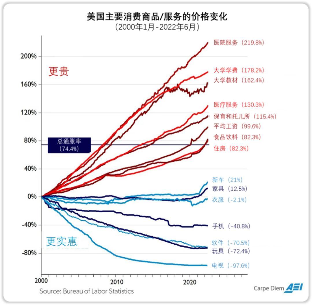 而教育、医疗、住房,以及由政府提供或控制的任何产品和服务,其价格都在疯狂上涨。