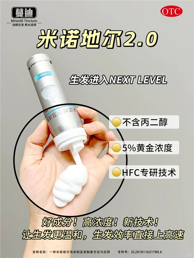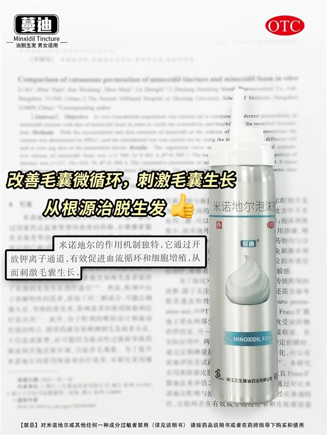 在众多外用米诺地尔产品中,米诺第二代蔓迪生发泡沫凭借其独特的配方与技术优势,在市场上获得了较高认可。蔓迪泡沫剂采用先进的制备工艺,将5%浓度的米诺地尔制成泡沫剂型。该泡沫剂质地轻盈、密度较低,涂抹后能迅速破裂,将药物均匀铺散在头皮表面,并沿毛干方向渗透到毛囊内部。此外,蔓迪泡沫剂能够利用非传统的快速渗透途径来输送药物至毛囊中蓄积,其渗透的速度是传统剂型的五倍,有助于加速毛发生长过程。同时,传统的液体剂型往往含有丙二醇等助溶剂,这类成分可能会引起部分人群的皮肤不适或过敏反应。蔓迪泡沫剂在配方中严格控制并避免了这类成分,从而大幅降低了头皮刺激性,适合敏感性头皮患者长期使用,保证使用过程中的舒适感。