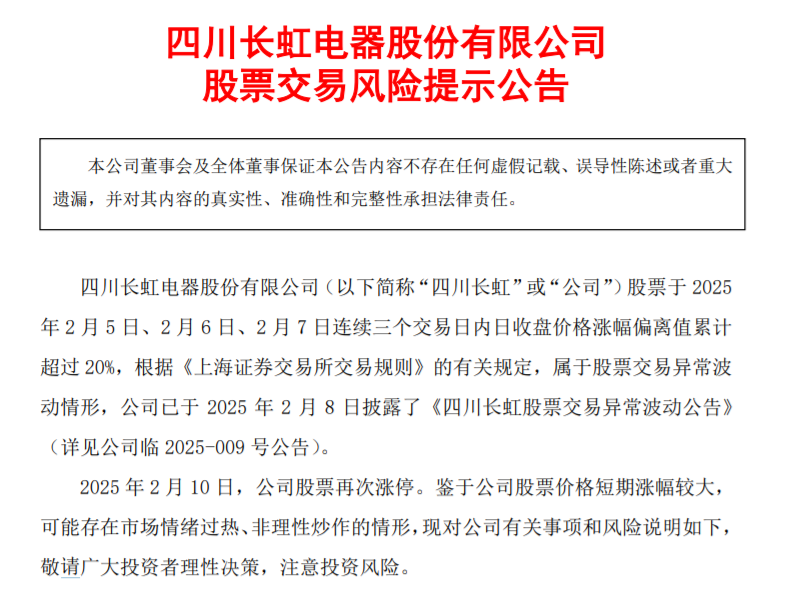 而几天前的2月8日,四川长虹才发布过同样的股票交易风险提示公告,因为其股价在2月5日-7日累计上涨超20%。