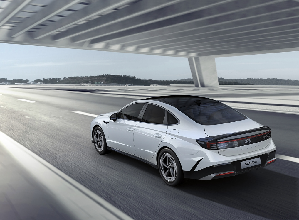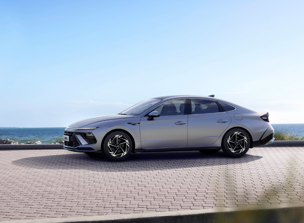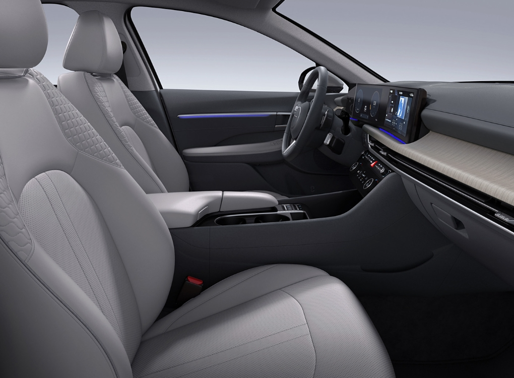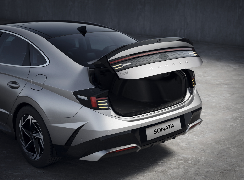 索纳塔标准版采用现代全球统一的“星际战舰”设计语言,前脸以夸张的六边形中网搭配贯穿式LED日行灯,车侧溜背线条+跨越式腰线,尾部则以“H”形贯穿尾灯收尾,整体造型激进且充满未来感。尺寸上,车长4945mm、轴距2875mm,后排腿部空间轻松两拳以上,但受溜背造型影响,头部空间稍显局促。