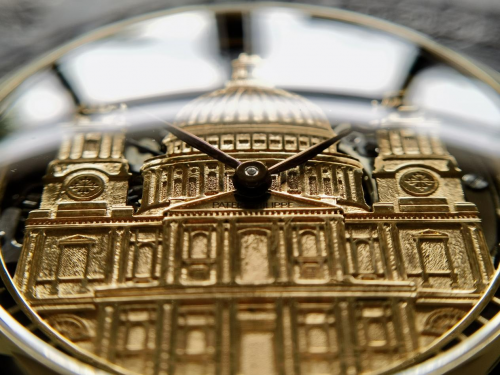 更令人叹服的是圣保罗大教堂雕刻版,雕刻大师以剔除金属的浮雕技法,将伦敦圣保罗大教堂的恢弘建筑细腻地呈现在表盘之上。其细节处理之精妙,让人仿佛透过腕表窥探到了时间沉淀下的建筑艺术。整道雕刻工序耗时超过120小时,每一道刻痕都承载着工匠对艺术与时间的敬畏。