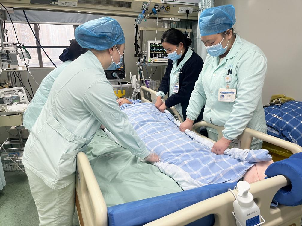由于患者身体管路多、做俯卧位通气很消耗体力,护理难度很大。为预防压力性损伤、管路意外滑脱以及药液中断而危及生命的等不良事件,ICU护士长胡彩珍带领护理团队为患者设计了一套个性化的翻身方案,创新使用改良“信封法”将患者包裹紧实,将患者从平卧位调整为俯卧位,再用海绵垫、软枕和自制的毛巾软枕为患者提供一个良好的体位支撑,既保证了患者俯卧时的舒适度,又保护了呼吸管路和输液通路。