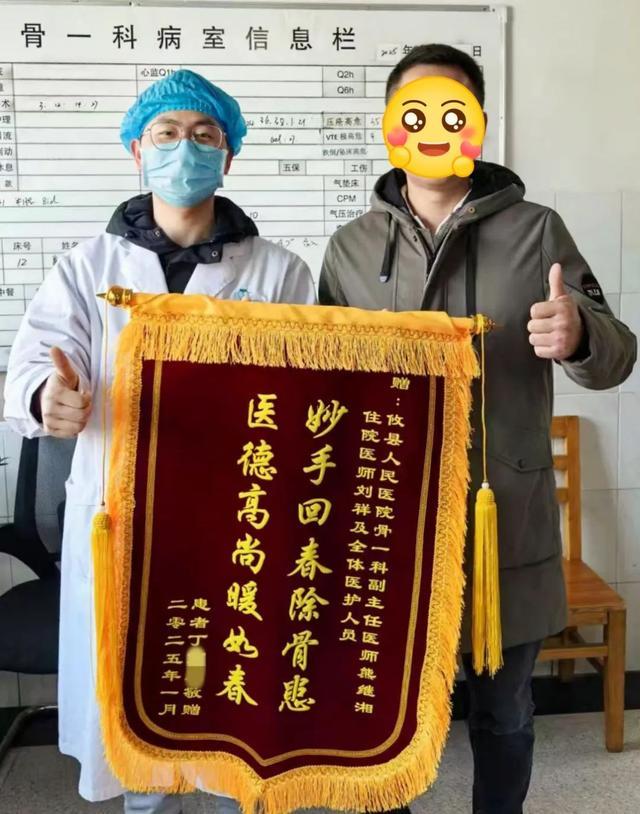 次日,骨一科再次迎来惊喜。丁大哥,一位因运动损伤导致左锁骨骨折的年轻患者,也带来一面写有“妙手回春除骨患,医德高尚暖如春”的锦旗,以此表达对骨科团队的深深谢意。